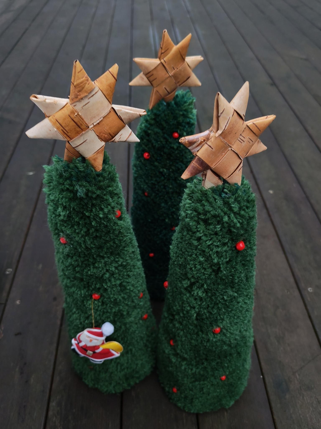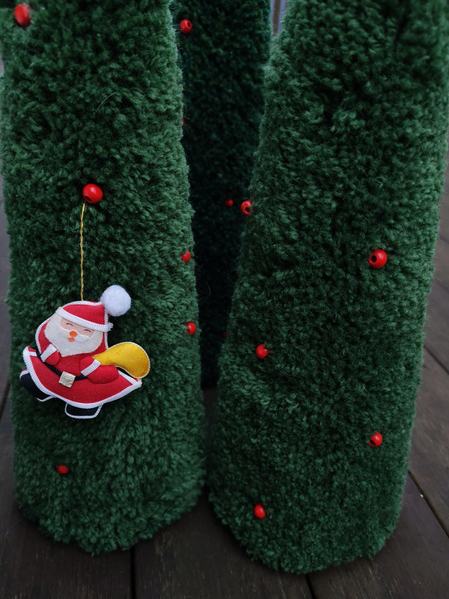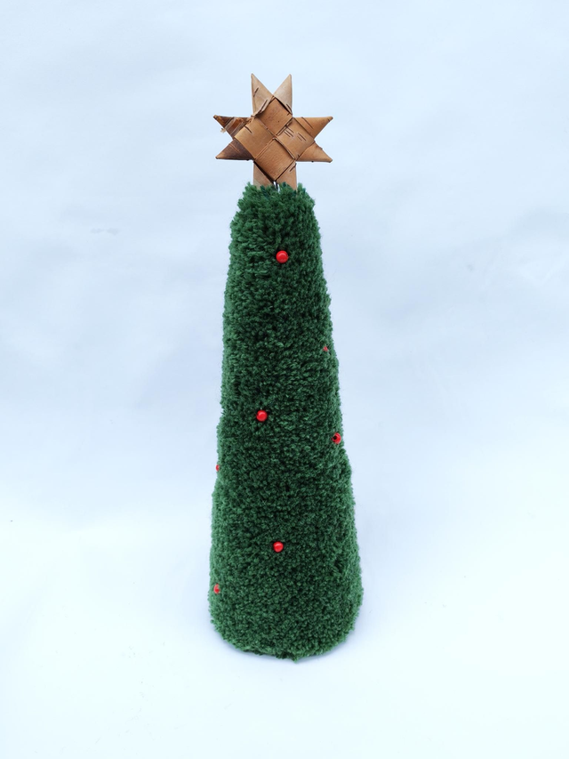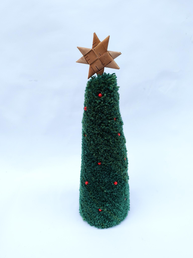 Small Christmas tree, approx. 35 cm high, tufted in wool yarn with red wooden balls. Approx. 10 cm in diameter.